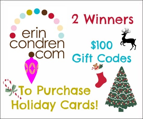 I have a $100 Erin Condren Gift Code for 2 winners. – Gift Codes are for the purchase of Holiday Cards, only.