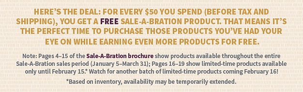 The 2016 Stampin’ Up! Catalog is out with so many fantastic new products…AND it’s Sale-a-Bration time! So why is Sale-a-Bration so wonderful? I’ll tell you why. For every $50 you spend (before taxes and shipping), you can choose a FREE….Yes FREE…SALE-A-BRATION PRODUCT. So this is the best time of year to stock up on Stamp Sets, Cardstock, Vellum, DSP (Designer Series Paper), and so much more. Sale-a-Bration lasts from now until March 31st. See below for full details.