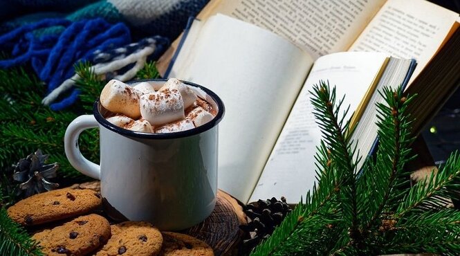 Books, cookies, mug of cocoa, and holiday greenery